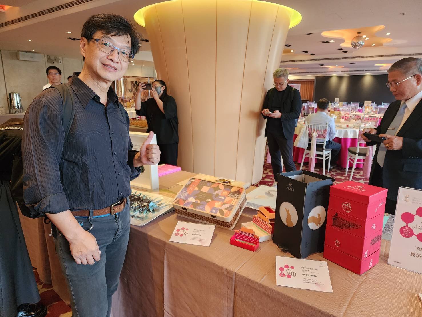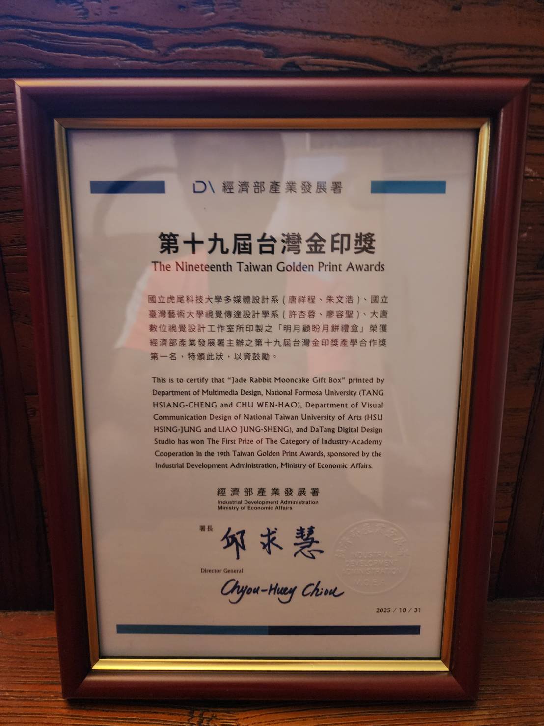 賀!!國立虎尾科技大學多媒體設計系朱文浩老師、唐祥程老師,與國立台灣藝術大學視覺傳達設計學系、大唐數位視覺設計工作室所印製之「明月顧盼月餅禮盒」榮獲經濟部產業發展署主辦之第十九屆台灣金印獎產學合作獎第一名