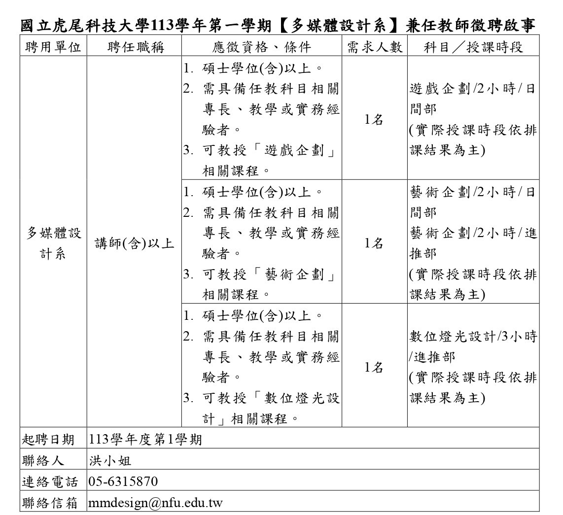 - 有意者請於113年04月22日前(以郵戳為憑)備妥上列之文件寄達聯絡人,請註明應徵兼任教師。(請使用燕尾夾即可,不需裝訂,應徵資料恕不退還)