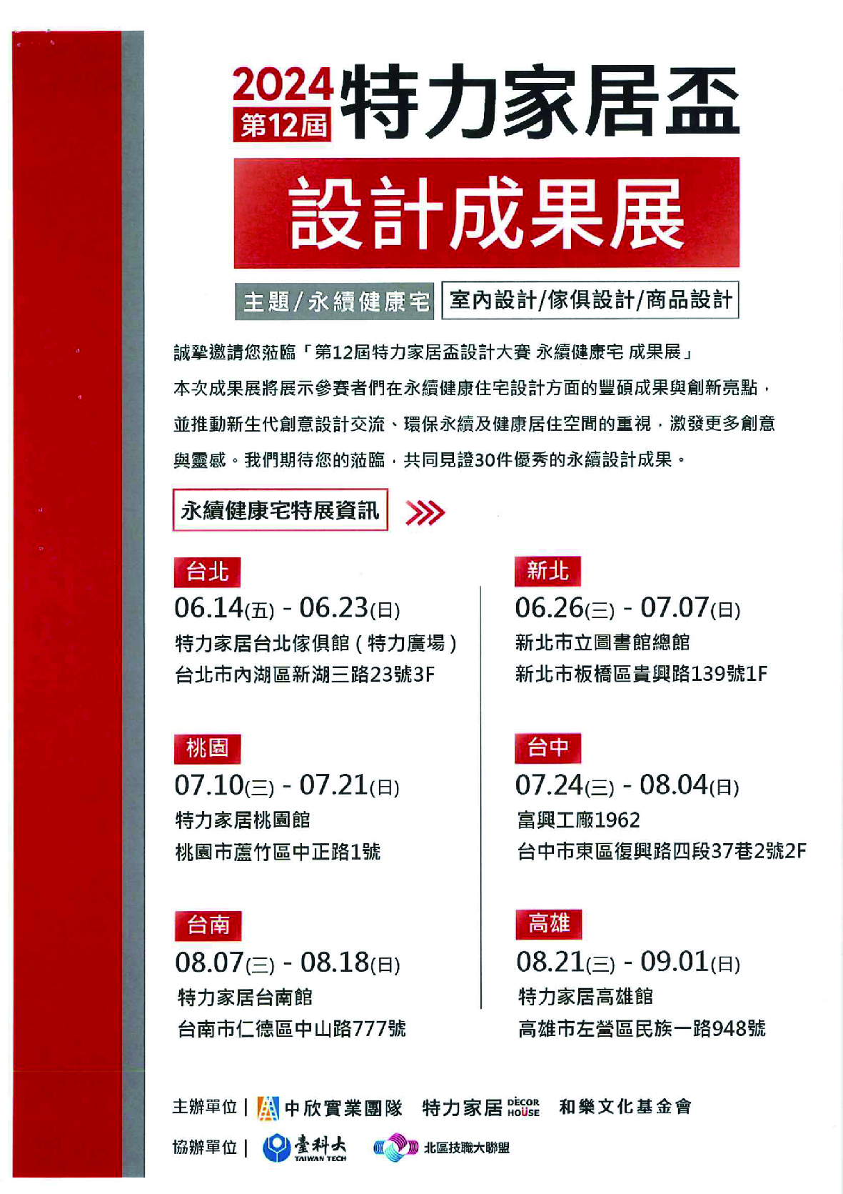 一、為促進學生設計創意,本集團特舉辦「特力家居盃設計大賽」,執行成果特規劃「第12屆特力家居盃設計永續健 康宅成果展」