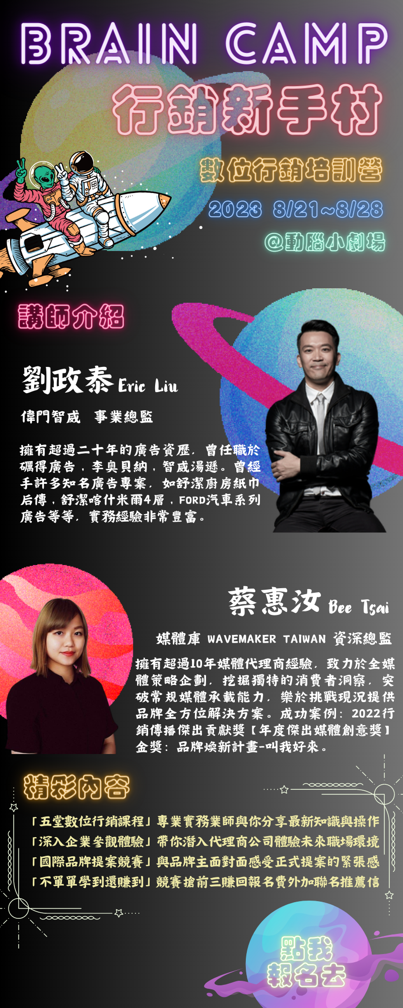 2023動腦暑假學生營隊【數位行銷人才培訓營】 2023-08-03 AdminAdmin 2023動腦暑假學生營隊【數位行銷人才培訓營】 <活動詳情&報名> https://www.accupass.com/event/2305161215281739263683 2023動腦暑假學生營隊【數位行銷人才培訓營】