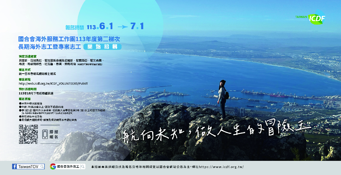 1. 請於113年7月1日前,至本會海外志工入口網完成報名,網址如下:https://web.icdf.org.tw/ICDF_VOLUNTEERS/PubVT